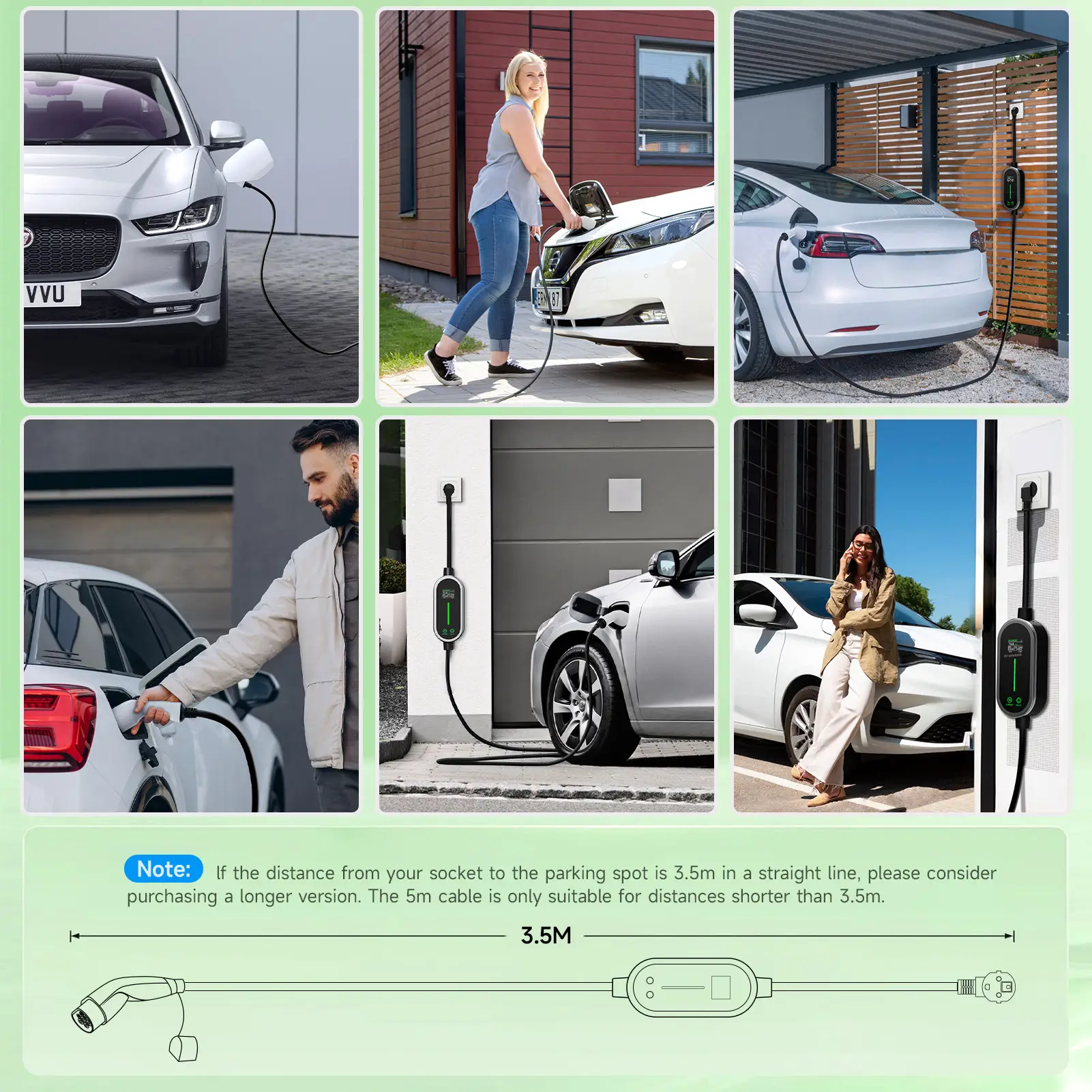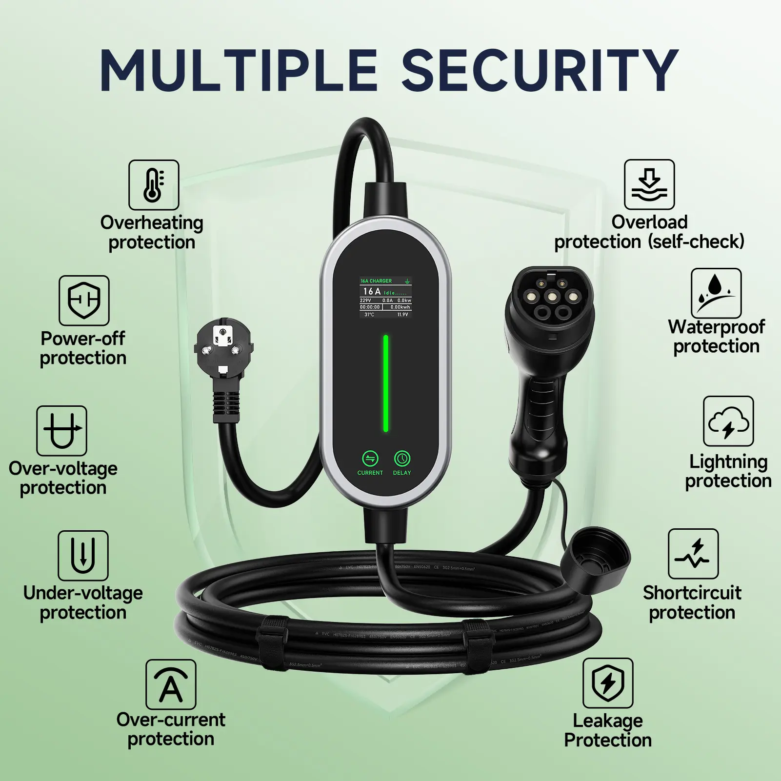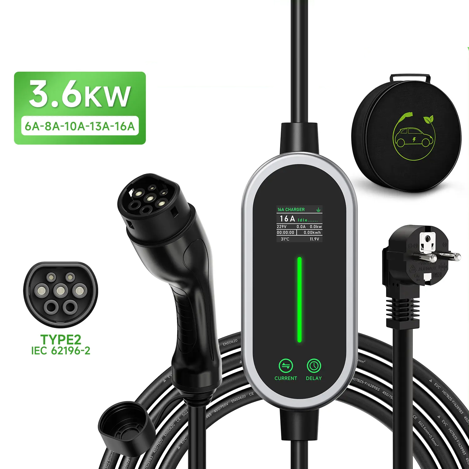 Operating Temperature:-30 °C ~ + 65 °C IP Rating:IP66 Voltage:110V-250V Current:6A/8A/10A/13A/16A adjustable Material:TPU,Copper Alloy,Silver Plating Color:Black Size:22x12x6cm Charger Type:Portable Charger Power:3600W Weight:1.9kg Total length:3.5m Type:Type 2 Number of Phases:Single Phase..